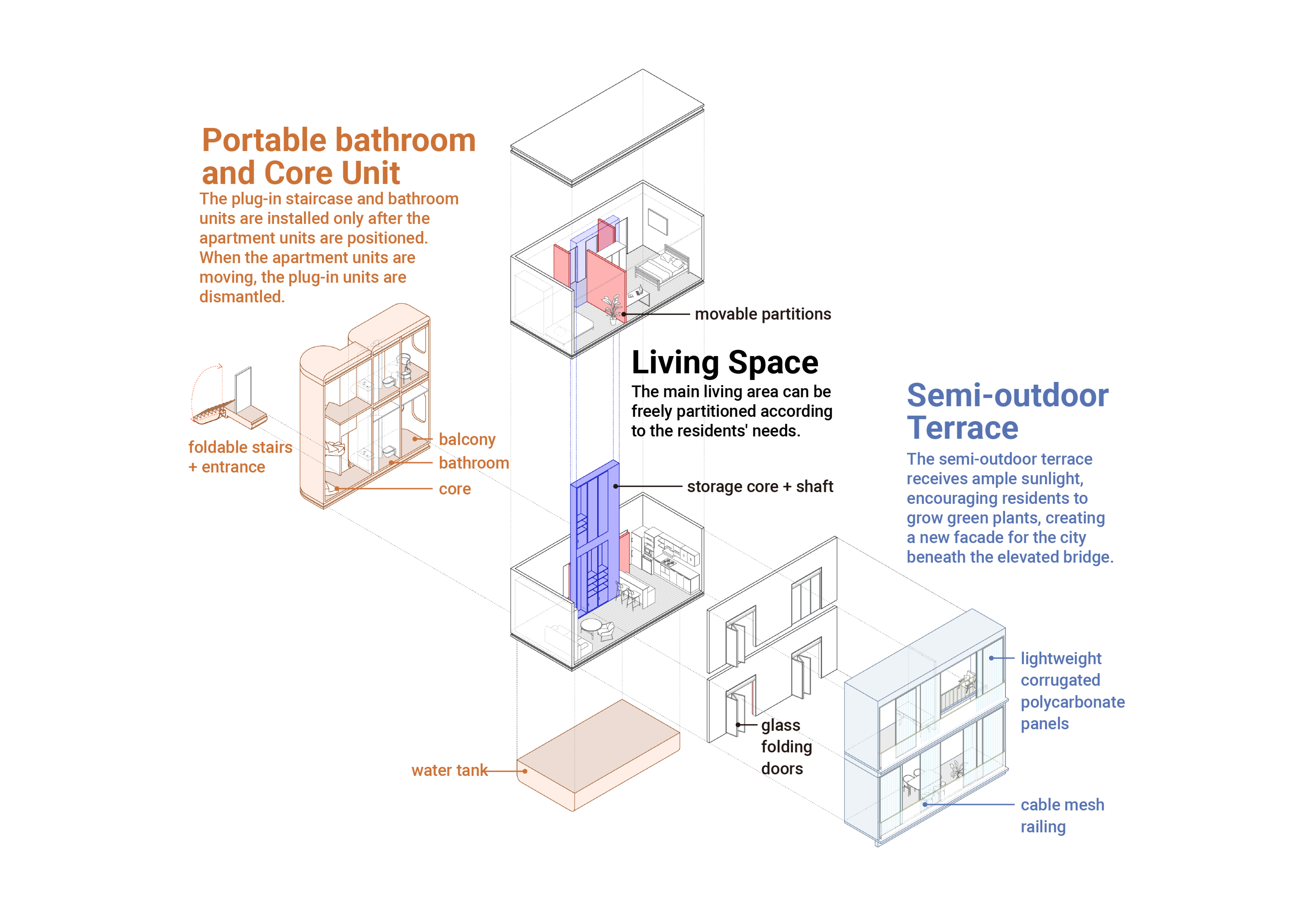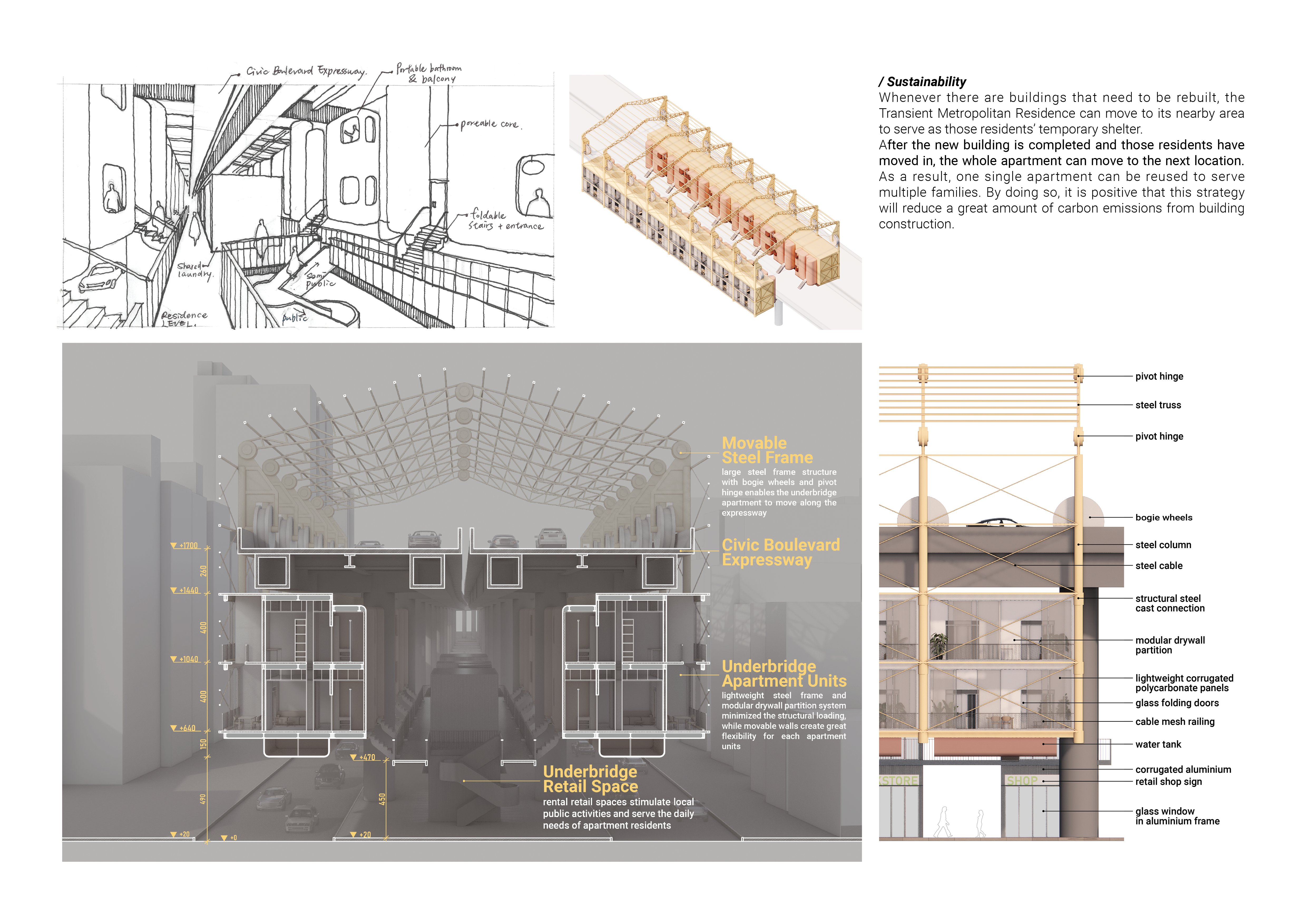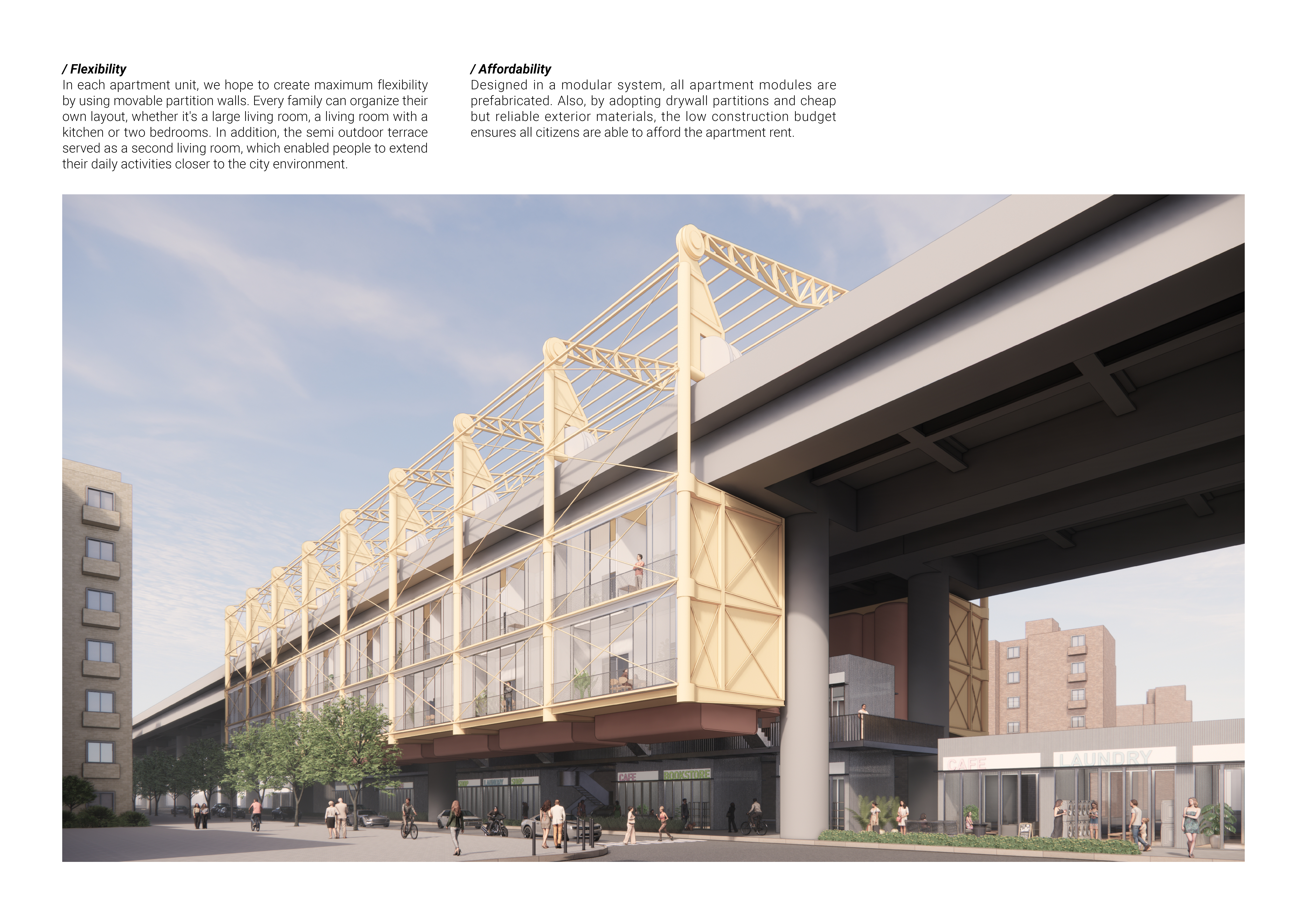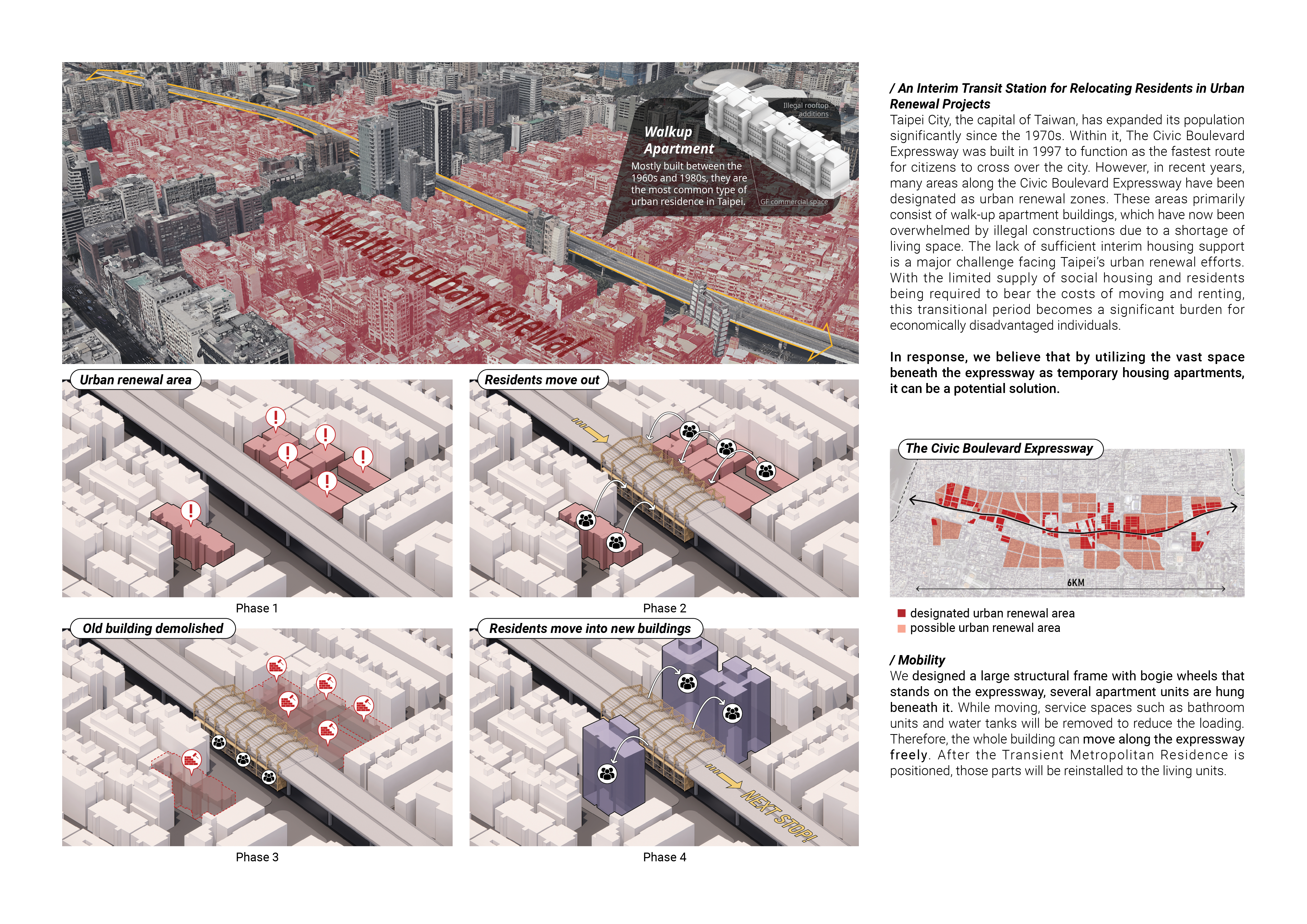 In the high-density city of Taipei, the urban fabric is three-dimensional. To alleviate traffic flow, there are numerous elevated roads and transportation systems at varying levels. However, these towering infrastructures often act like barriers, disconnected from the dense urban life around them. This led me to question whether it is possible to break free from the traditional notion of housing being fixed to the land, and instead, leverage the existing urban infrastructure to promote the city's renewal and evolution.