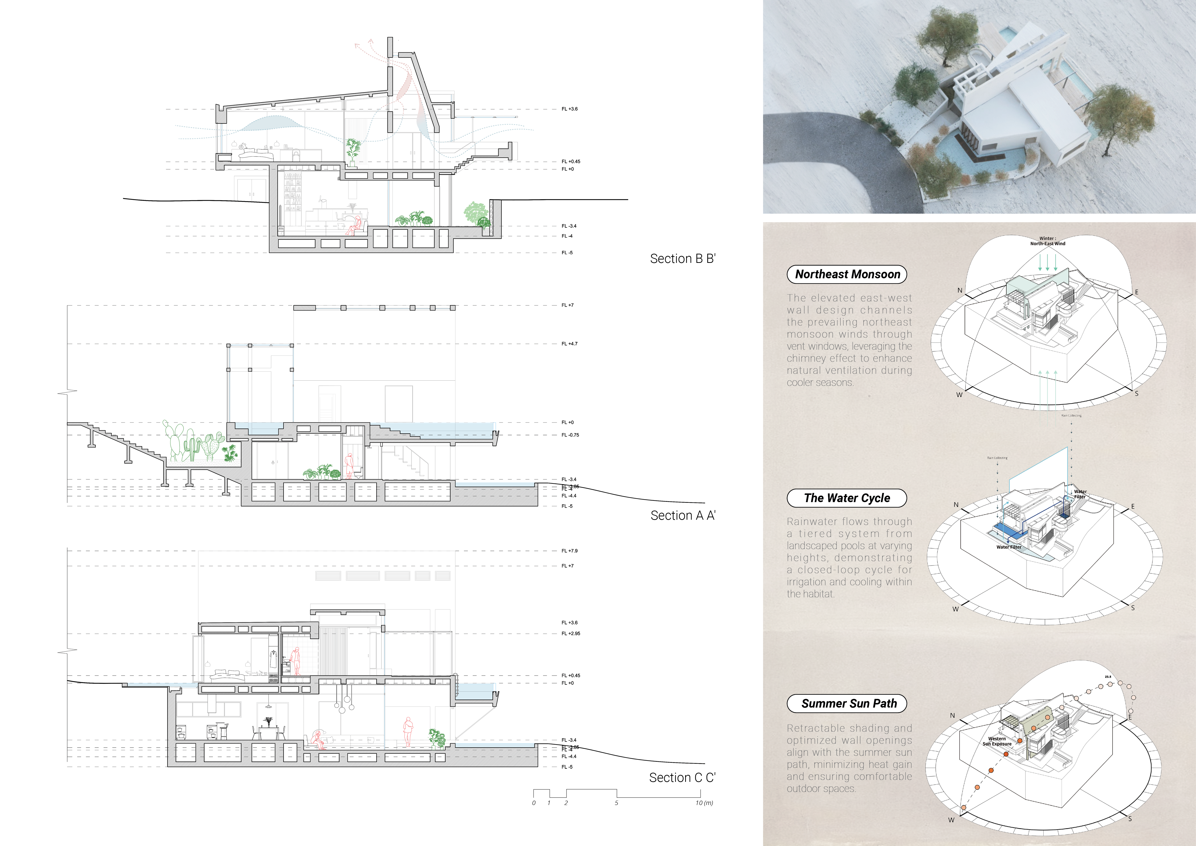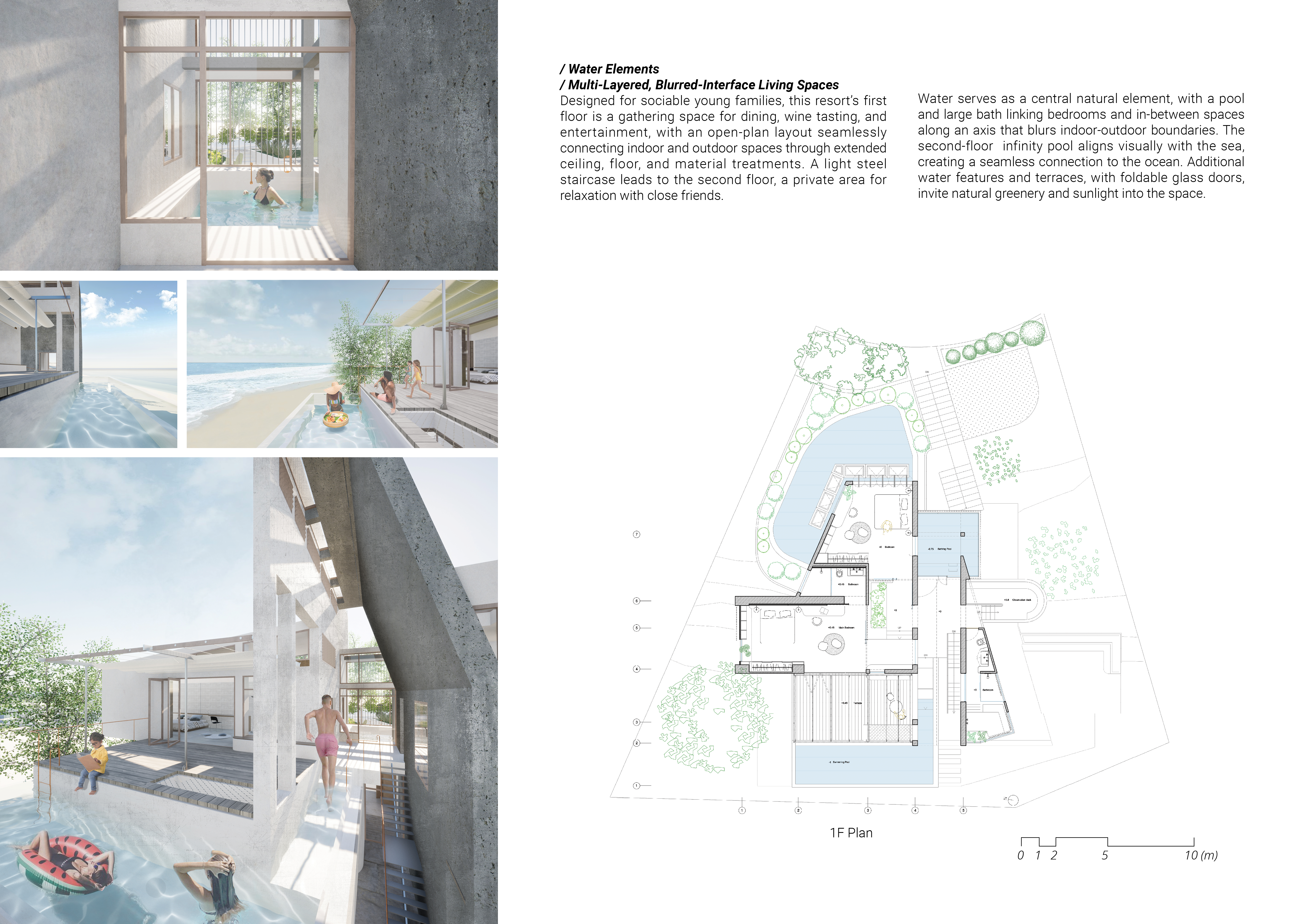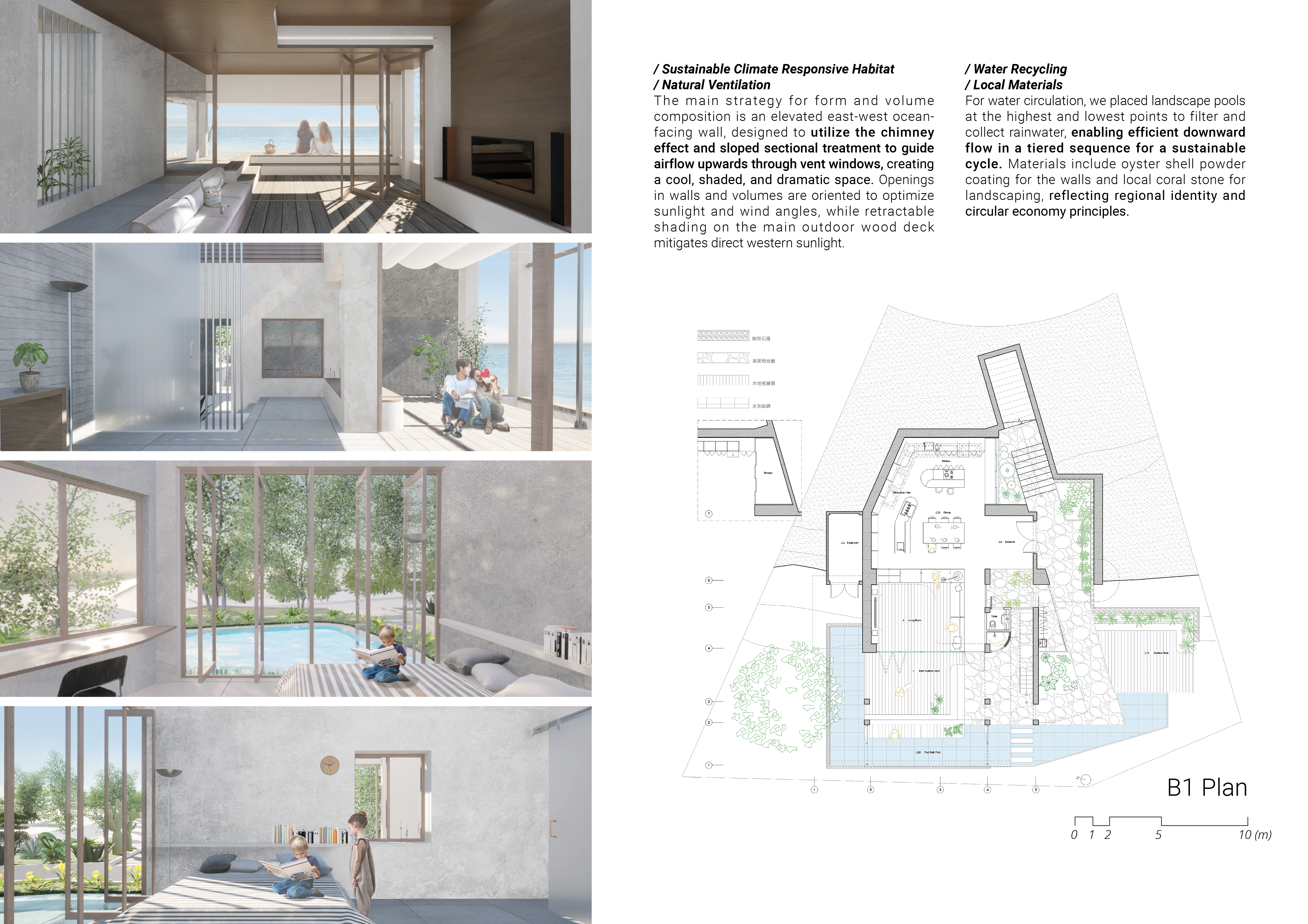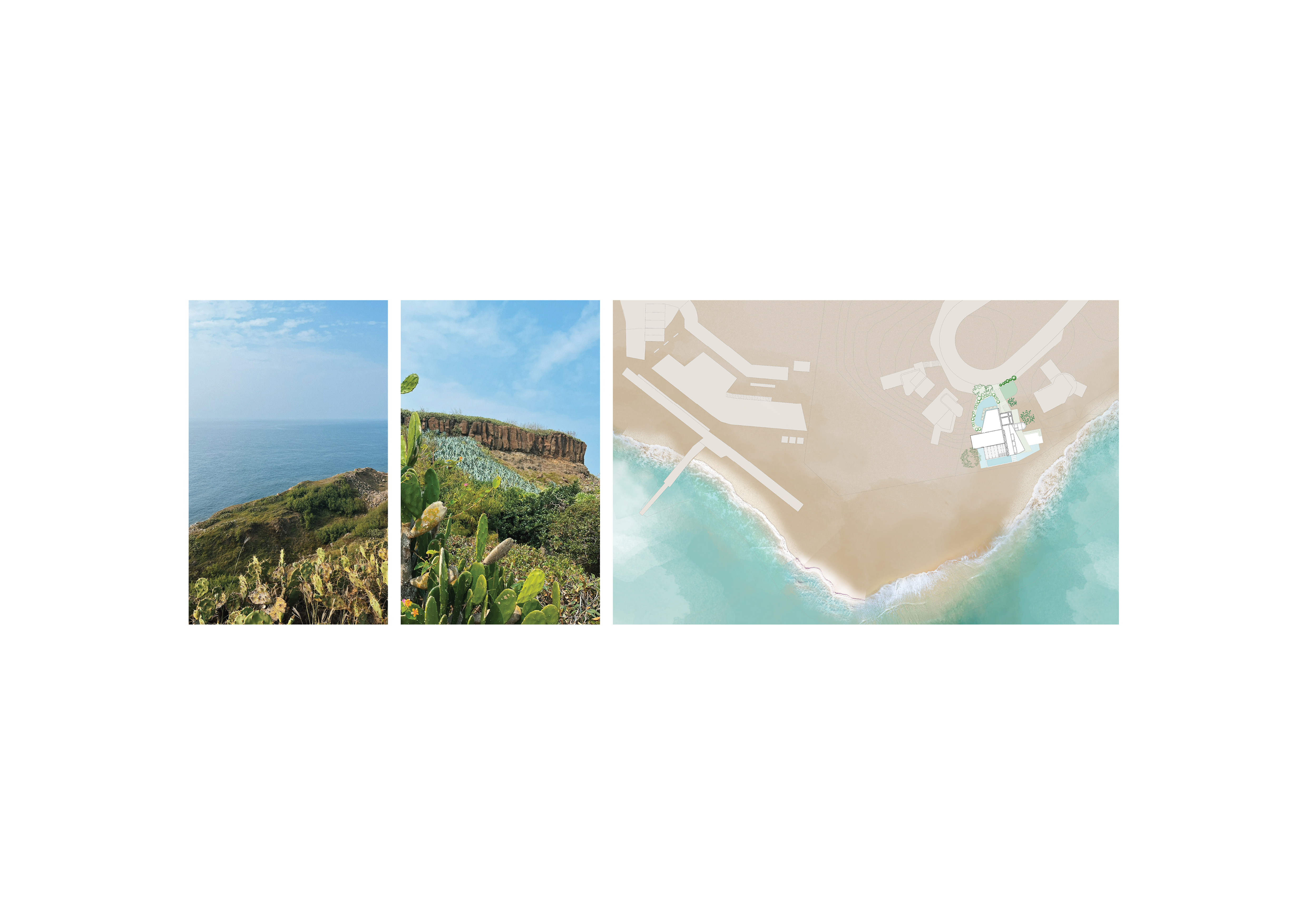 This project is an international competition organized by the ARGO Yacht Club in Qingwan, Penghu, aimed at transforming idle land into a resort. The competition's theme emphasizes sustainability and harmonious coexistence with the ocean, promoting an immersive experience that integrates the unique features of the local environment through travel and lifestyle. Penghu, known for its expansive natural seascapes, boasts rich topography and abundant marine resources. Unlike typical coastal landscapes, Penghu’s rugged volcanic coastline ranges from towering cliffs to gentle shores, creating a dynamic scenery that enhances sensory experiences. The target guests for this resort are travelers staying a week or longer, making it essential to design Penghu, known for its expansive natural seascapes, boasts rich topography and abundant marine resources. Unlike typical coastal landscapes, Penghu’s rugged volcanic coastline ranges from towering cliffs to gentle shores, creating a dynamic scenery that enhances sensory experiences. The target guests for this resort are travelers staying a week or longer, making it essential to design a living space that responds to the surrounding environment. Thus, Creating an interface with nature through architecture is the main challenge of this design.